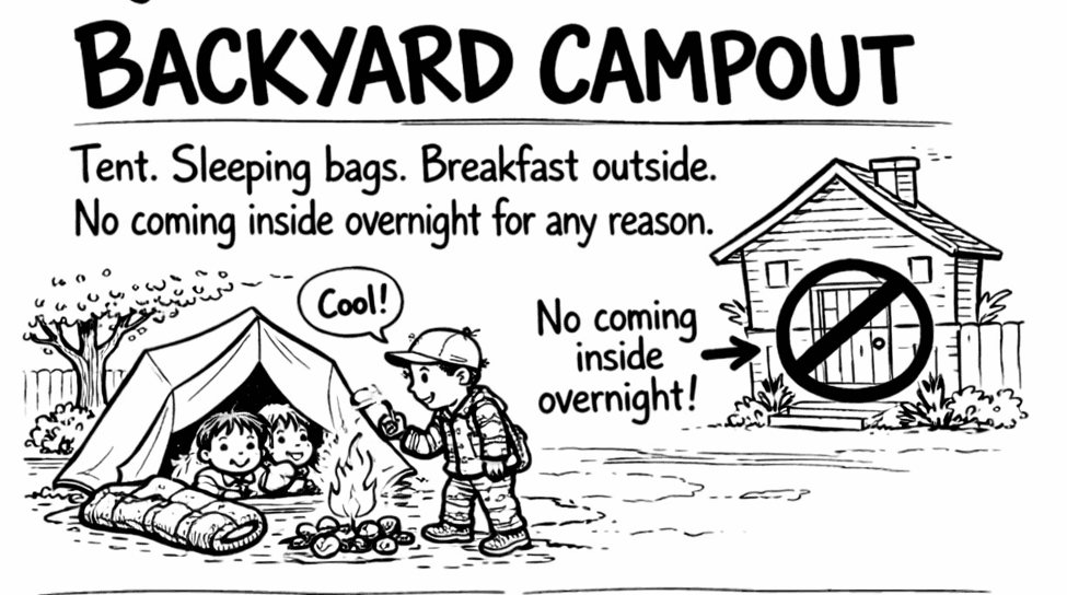 Foil packets over fire. No stovetop allowed. Kid cooks outside only.