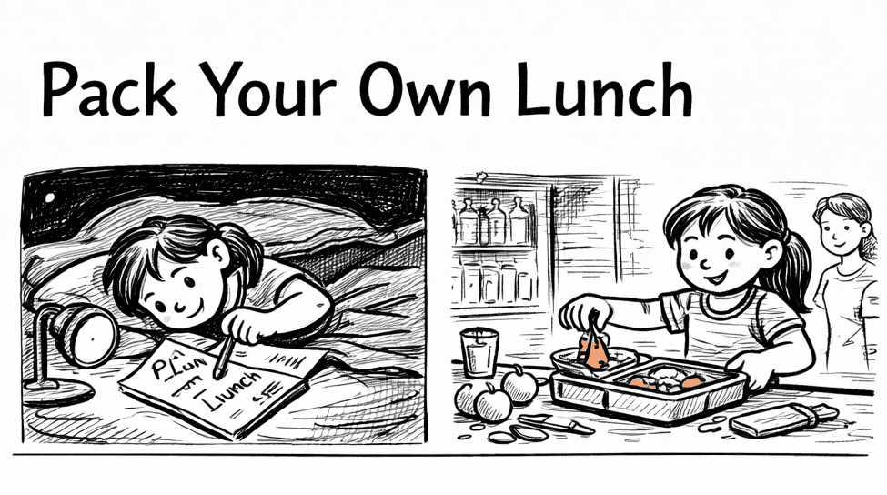 Plan it the night before. Protein, grain, fruit, veg. No swaps at school.